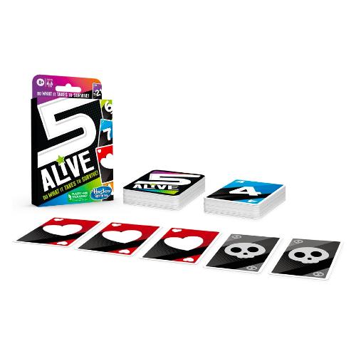 Preparati per un gioco di carte imprevedibile, super veloce e adatto a tutta la famiglia! Il gioco 5 alive è una variante del classico gioco ""21"" in cui i giocatori ricevono carte numerate, ognuna con un valore nominale, e devono mantenere il totale al di sotto di 21 per rimanere in vita. Fai di tutto per sopravvivere! Assumiti rischi, intraprendi strategie e sabota gli avversari costringendoli a perdere vite! Se qualcuno supera 21, deve capovolgere una carta alive. Una volta capovolte tutte e 5 le carte, è fuori dal gioco. I giocatori vengono eliminati fino a quando non rimane un solo vincitore! Segui le istruzioni sulle carte jolly per colpire un avversario o rimanere in vita. Aggiungi un po' di adrenalina con la versione alternativa con morte improvvisa per una partita ancora più veloce, oppure gioca in squadre. Questo gioco è facile da imparare e veloce da giocare, quindi ideale per una serata di giochi in famiglia o per una festa improvvisata. Portalo con te per giocarci in viaggio. È un gioco divertente che i bambini e le bambine possono fare mentre sono in macchina o un'ottima attività da fare in casa per 2-6 giocatori, dagli 8 anni in su.