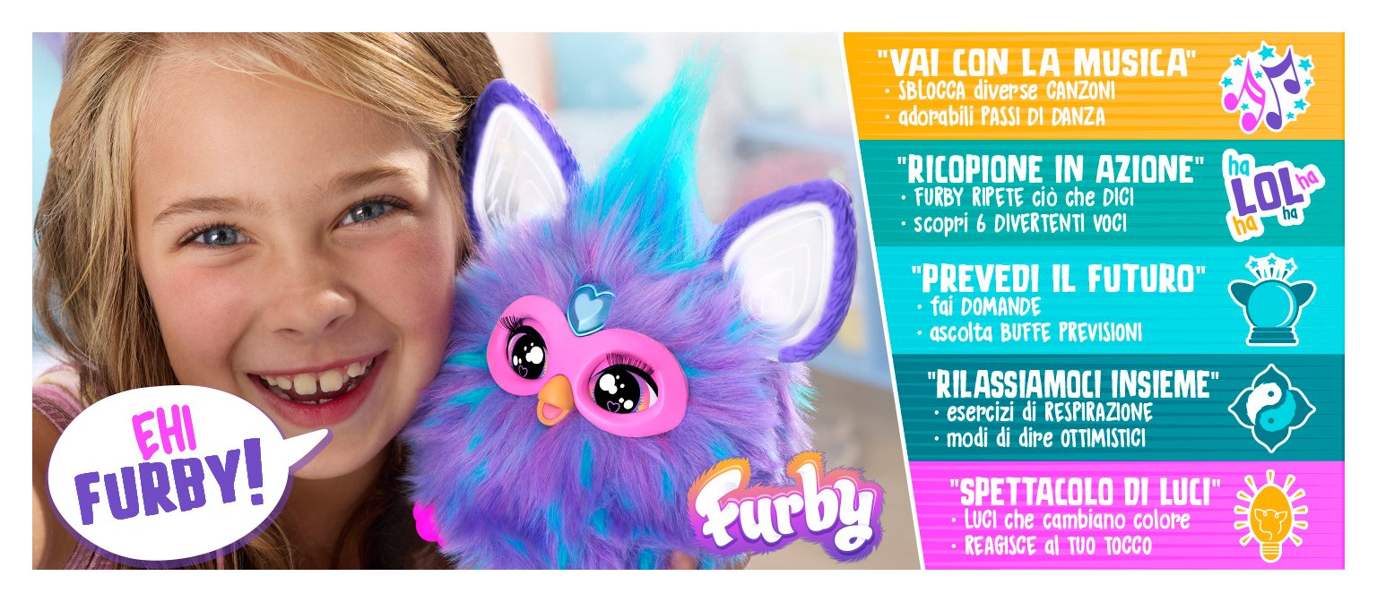 Regala a bambini e bambine un peluche con cui stringere un'amicizia speciale grazie a questo incredibile giocattolo interattivo per bambini e bambine che si muove, parla, canta, si illumina e risponde alle tue frasi; premi la gemma a forma di cuore di furby e di' "ehi furby!" In modo che furby possa sentire, poi pronuncia un comando per scoprire ciascuna modalità (non si connette a internet); parla, canta e ridi insieme a questo giocattolo parlante che offre tantissime reazioni adorabili, spassose e a volte anche un po' impertinenti. Furby è anche un giocattolo ballerino con occhi che si aprono e chiudono e orecchie che si illuminano con effetti luminosi di diverso colore; se metti insieme 2 amici furby, possono interagire tra di loro! Ciascun furby venduto separatamente ; bambini e bambine possono personalizzare il proprio stile e quello di furby. Con le perline a clip e il pettine, possono acconciare il suo ciuffo di capelli o creare un braccialetto o una collana dell'amicizia . Furby è un regalo fantastico per bambini e bambine da portare con sé quando si viaggia o per giocarci nella propria camera. Trova il tuo furby e dona un regalo indimenticabile