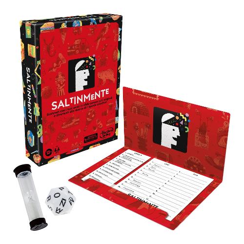 Pensa in fretta, sii originale e non perdere la concentrazione! In Saltinmente occorre tirare il dado con le lettere a 20 facce, capovolgere la clessidra e pensare a risposte originali per ogni categoria sulla lista. I giocatori devono scrivere le risposte prima dello scadere del tempo. Le risposte possono riguardare categorie come gli oggetti nella tua macchina, i reality show, animali famosi e cose che non dovresti toccare, e tutte devono iniziare con la lettera uscita sul dado. In questo divertente gioco da tavolo per 2 o più giocatori, ottieni punti per le risposte a cui nessun altro giocatore ha pensato. Più originali saranno le tue risposte, minori saranno le probabilità che qualcun altro le abbia scritte e maggiori saranno invece i punti che accumulerai. Gli strumenti virtuali migliorano il gioco, offrendo ai giocatori la possibilità di usare un timer e un dado con le lettere online. Questo gioco da festa per adulti e adolescenti dai 13 anni in su presenta più di 190 categorie e 20 lettere sul dado, perfetto per intrattenere gruppi fino a 6 persone che possono giocarci più e più volte. SALTINMENTE e HASBRO e i relativi marchi commerciali e loghi sono marchi commerciali di Hasbro, Inc.