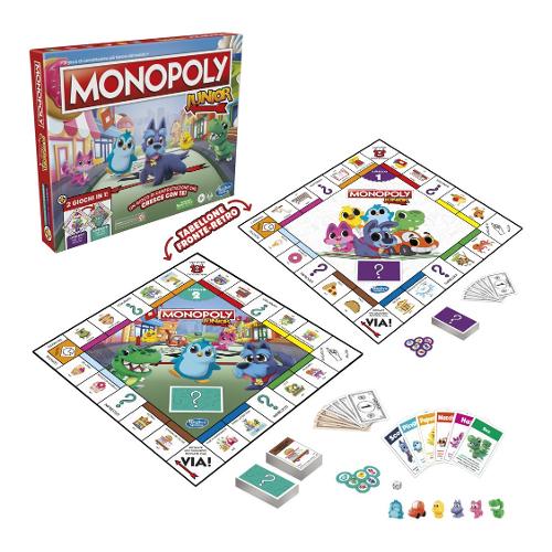 Con 2 giochi in 1, monopoly junior è il gioco di contrattazione che cresce con i tuoi figli! Il tabellone fronte-retro offre 2 livelli di gioco, in modo che le famiglie possano scegliere quello più adatto a loro. Il livello 1, consigliato per bambini e bambine di 4-5 anni, li aiuta a esercitarsi a contare e abbinare, perché richiede loro di contare le caselle, abbinare le figure e acquistare le proprietà. Vince il giocatore che possiede il maggior numero di proprietà! Pronti per salire di livello? Capovolgi il tabellone per il livello 2 che offre una modalità di gioco più avanzata, consigliata dai 6 anni in su, incentrata sulla lettura e su semplici esercizi di matematica. I giocatori possono fermarsi su caselle adatte ai più piccoli, acquistare proprietà, riscuotere l'affitto e incassare una fortuna! Per vincere, devono essere il giocatore che ha incassato più denaro. La modalità di gioco di ogni livello è basata sull'utilizzo di uno specifico set di denaro e carte monopoly, così come di regole. Ciascuna delle due modalità include 6 adorabili pedine: pinguino, automobile, paperella, il cane scotty, il gatto hazel e rex. Tirate fuori dalla sua scatola questo divertente gioco per età prescolare, perfetto per giornate di giochi e serate in famiglia, e preparatevi a creare ricordi indimenticabili. I nomi e i loghi di hasbro gaming e di monopoly, nonché il disegno distintivo del tabellone, le quattro caselle angolari, il nome e il personaggio mr. Monopoly, ogni elemento distintivo del tabellone e pezzo del gioco sono marchi di fabbrica di hasbro in ordine al proprio gioco di compravendita di immobili e alle attrezzature di gioco.