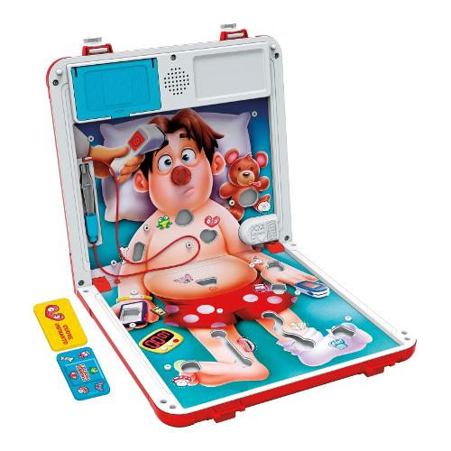 Sei un —bzzzt!— Bravo dottore. È il gioco da tavolo già amato da bambini e bambine, ma con aggiornamenti entusiasmanti! In questa edizione del gioco l'allegro chirurgo, puoi scegliere tra due modi di giocare: la modalità ospedale per il gioco classico o la modalità emergenza per una frenesia al limite del possibile. Nella modalità ospedale, i piccoli dottori pescano carte cerotto per buffe parti anatomiche doloranti. La suspense aumenta mentre cercano di operare su dario, il malato immaginario con mano ferma. Se sbagliano qualcosa, —bzzzt!— Il suo naso rosso si accende! Nella modalità emergenza, si gareggia per eliminare il maggior numero possibile di parti anatomiche doloranti prima dello scadere del tempo. Attenzione però! Se le pinzette colpiscono il lato, dario, il malato immaginario rutta, geme ed emette altri suoni isterici che faranno ridere bambini e bambine! In entrambe le modalità, vince chi rimuove il maggior numero di parti anatomiche doloranti e ""guarisce"" il proprio paziente. Questo adorabile gioco include una valigetta tutto in uno con custodia, il che lo rende un ottimo gioco da viaggio per bambini e bambine con cui giocare sempre e ovunque.