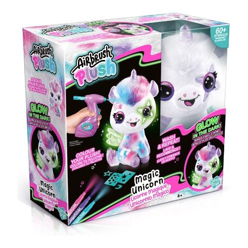 Airbrush plush magic unicorn un tenerissimo unicorno, con magici inserti che si illuminano al buio; all'interno della confezione troverai tutto l'occorrente per sbizzarrirti in decorazioni uniche e originali: ottieni un effetto strepitoso con l'aerografo elettrico, i pennarelli colorati e gli oltre 60 stencil inclusi! Lava il tuo cucciolo per rimuovere il colore e ricominciare a giocare: con airbrush plush, la creatività non ha limiti! La confezione comprende 1 unicorno peluche che si illumina al buio 1 aerografo elettrico 1 foglio con oltre 60 stencil riutilizzabili 3 pennarelli spray lavabili adesivi