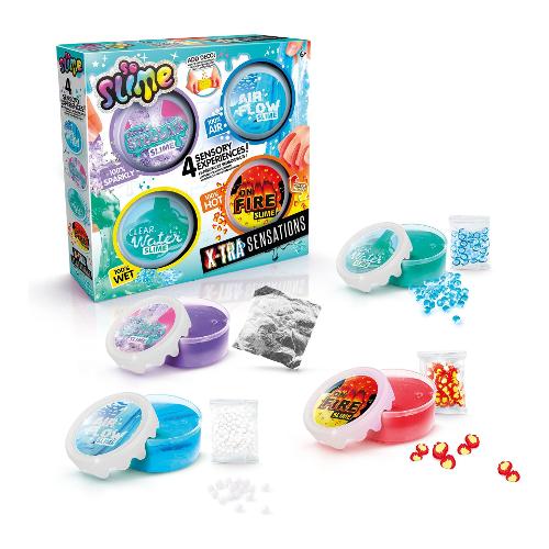 Confezione 1 slime magic stellar • 1 slime clear water • 1 slime on fire • 1 slime air flow • 4 bustine di decorazioni