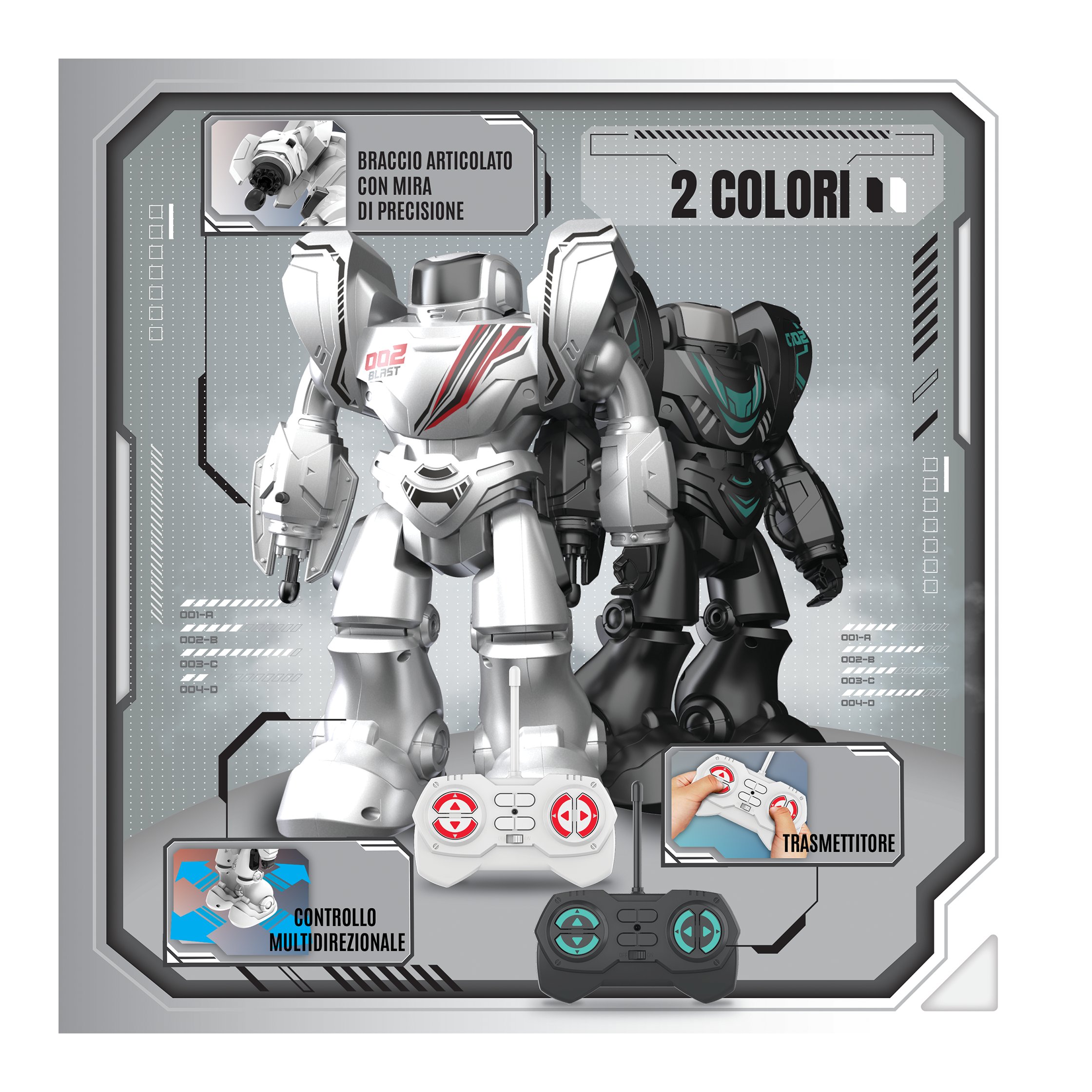 Entra nell'arena con robo blast one! Disponibile nei colori nero e bianco, questo robot da 26 cm è pronto per
