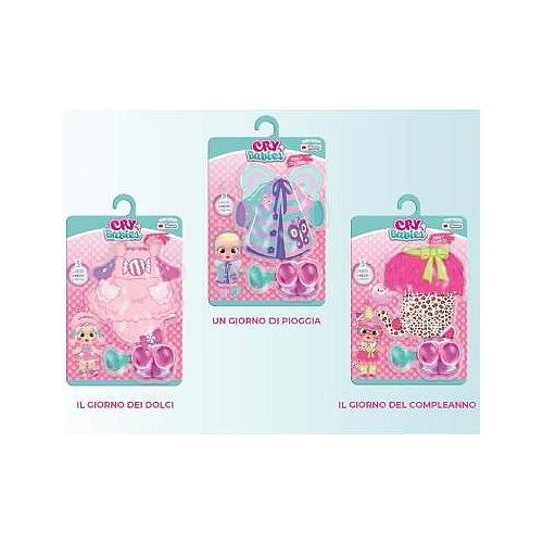 Ora tutti i cry babies possono indossare vestiti veri! Scopri i tre outfit: un giorno di pioggia, il giorno del compleanno e il giorno dei dolci. Amplia l'armadio dei tuoi Cry Babies!