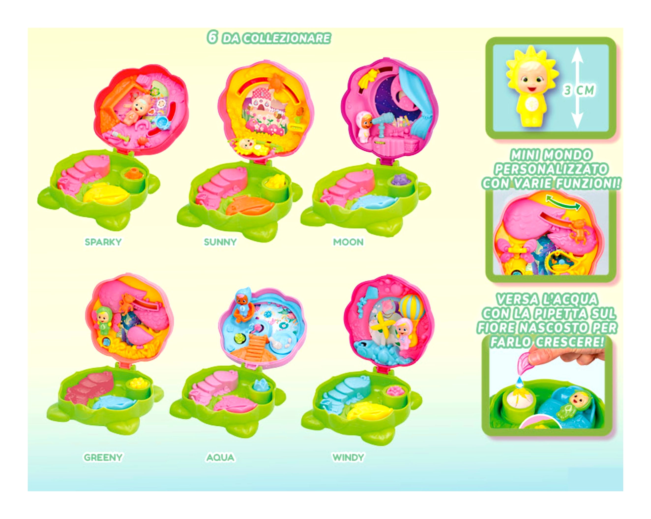 Piccoli a prendersi cura del pianeta e dell'ambiente con piccoli consigli educativi. All'interno di ogni capsula scoprirai un mini mondo personalizzato e con varie funzioni e 4 sorprese: un mini personaggio, una pipetta, un fiore magico e un leaflet! Versa l'acqua con la pipetta sul fiore nascosto per farlo crescere. Ogni personaggio rappresenta un elemento della natura.