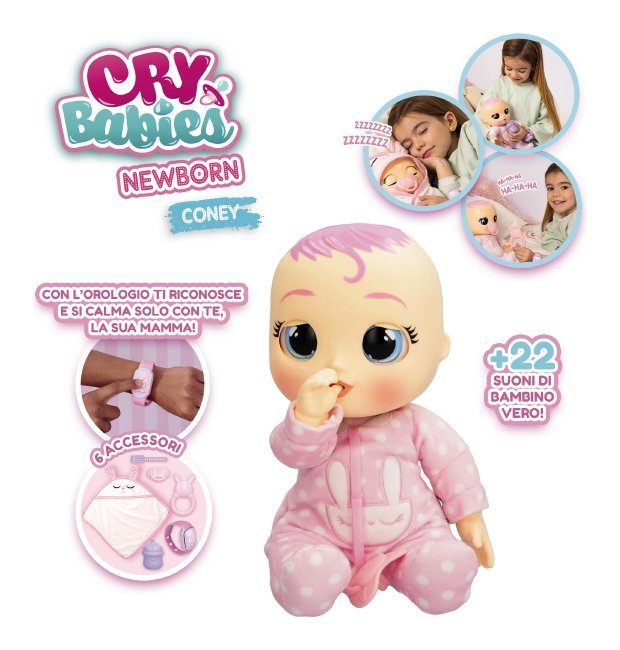 Diventa la migliore mamma o papà con li newborn coney di cry babies! Come una vera neonata, coney è piccola, tenera e morbidissima ed è alta 30cm. Prenditi cura di lei come fosse la tua vera bambina! Coney emette suoni realisticidi di bebè. Si addormenta quando la sdrai, chiudendo lentamente ali occhi e li apre al tirarla su. Puoi far finta di allattarla dandole il biberon! Inoltre, come tutti i cry babies. piange lacrime vere e smette di piangere con il ciuccio. Ma per farla calmare davvero devi prenderla tra le tue braccia, dopo aver indossato il braccialetto affinchè di riconosca come la sua mamma... così solo con te si sentirà sicura e a suo agio per riaddormentarsi! Inoltre, adora giocare con il suo sonaglio preferito! Viene fornita con 6 accessori: ciuccio, biberon,coperta personalizzata, sonaglio, braccialetto di nascita e braccialetto elettronico da indossare per la bambina