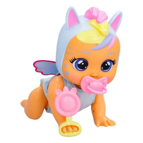 bambino! Quando i bambini premono li pulsante nuvoletta sula sua schiena, inizia a gattonare! Quando è sdraiata e el fai li solletico, muove braccia e gambe e ride! Se la fai sedere e le metti in manoil sonaglio, muoverà le braccia per giocarci! Jenna ha occhi e capelli dipinti e indossa un fantastico pigiamino da unicorno. Include anche il ciuccio e il suo sonaglio preferito! Come tutti i Cry Babies piange lacrime vere senza il suo ciuccio. Rimettiglielo e smettera di piangere. Emette 35 veri suoni realistici da bambina.