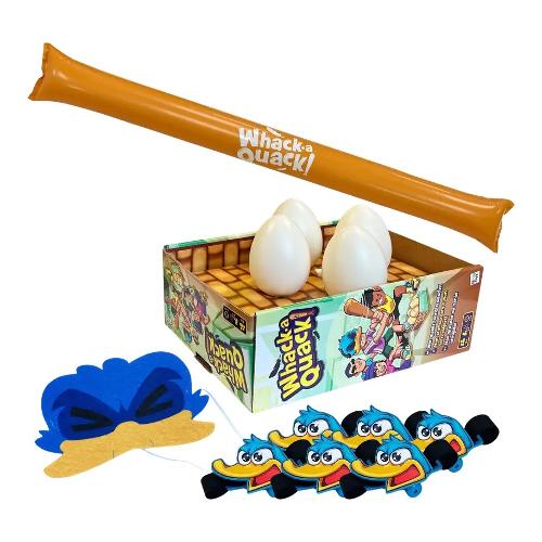 Preparatevi per Whack-a-Quack! In questo gioco dinamico, un giocatore deve proteggere le uova, usando una maschera e una mazza gonfiabile per proteggere le preziose uova. Nel frattempo, gli altri giocatori, dotati di zampette da papera squittenti, cercano di rubare le uova senza farsi catturare. La sfida è schivare la mazza in movimento e afferrare le uova. Con regole semplici e un divertimento senza fine, Whack-a-Quack offre un divertimento ad alta energia per tutte le età con gli amici.