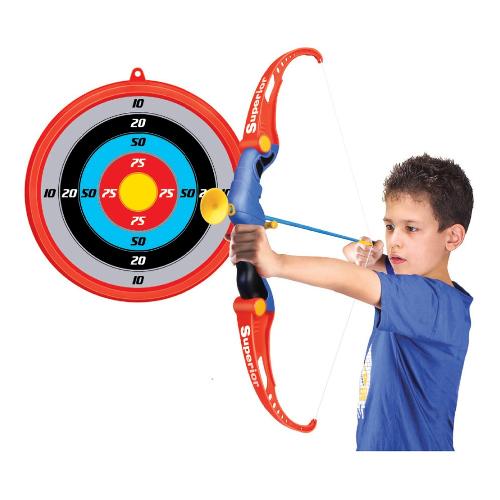 Set arciere composto da arco 66 cm con foro guida stabilizzatore integrato nel telaio, bersaglio d.23 cm e 3 frecce con ventosa