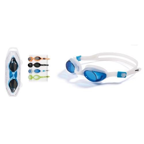 Occhiali nuoto in silicone non allergenico con montatura monopezzo e fascia regolabile. Lenti in policarbonato antiappannamento e protezione uv