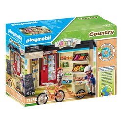 Il set comprende due personaggi PLAYMOBIL, un negozio con distributore automatico di latte, uova, frutta, verdura e altri prodotti alimentari.
