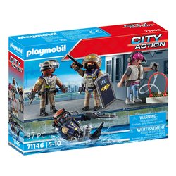 La squadra dell' unità speciale è pronta ogni volta che la polizia playmobil ha bisogno di un supporto extra. Il playset contiene tutto ciò che serve ai giovani poliziotti per mettere insieme una squadra di pronto intervento, come un sommozzatore dell' unità speciale, un coordinatore delle operazioni e un ufficiale. Con le sue attrezzature speciali, la squadra è alle calcagna del fuggitivo. Il crimine non ha scampo contro questa task force! Con edifici ricchi di funzioni, fantastici veicoli e diversi personaggi, la linea PLAYMOBIL City Action stimola un gioco di ruolo divertente e fantasioso. con quattro personaggi PLAYMOBIL, tre dell' Unità Speciale e una criminale donna, bombola, casco, GPS, piede di porco e numerosi equipaggiamenti per inseguimenti ricchi di azione nella cameretta dei bambini.