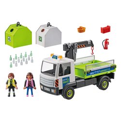 Il playset comprende due personaggi playmobil, un camion per trasporto rifiuti con cassone e gru flessibile, due contenitori, bottiglie e altri accessori per divertenti avventure di gioco di ruolo nella cameretta dei bambini. Per inserire i personaggi, il tetto del camion può essere rimosso.