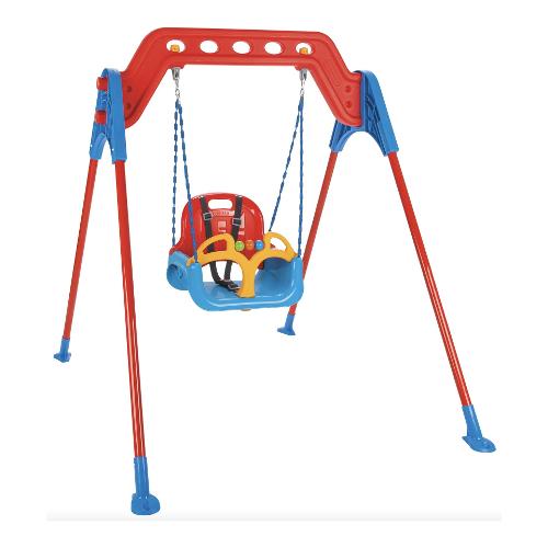 Solida altalena alta 140 cm, seggiolino 3 in 1 modificabile secondo l'età del bambino, corde in metallo ricoperto e moschettoni per l'attacco, piedi stabilizzatori