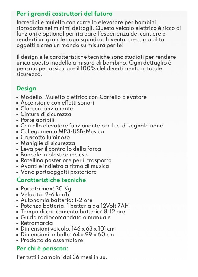 Incredibile muletto con carrello elevatore per bambini riprodotto nei minimi dettagli. Questo veicolo elettrico è ricco di funzioni e optional per ricreare l’esperienza del cantiere e renderti un grande capo squadra. Inventa, crea, mobilita oggetti e crea un mondo su misura per te!