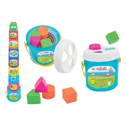 Betta simpatica torreta è una divertente attività 2 in 1 che stimola tatto, vista e coordinazione. Incastra le formine geometriche nel foro corrispondente sul tappo del secchiello oppure impila i cilindri nell'ordine corretto. Ogni secchiello contiene 8 cilindri e 6 formine geometriche di colore e forme diversi.