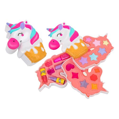 Pratico cofanetto trucchi su 3 livelli a forma di un dolce unicorno: muovi i livelli e scopri coloratissimi ombretti e lip gloss per un trucco sempre perfetto! Trucchi testati e certificati per tutti i tipi di pelle, lavabili con acqua.
