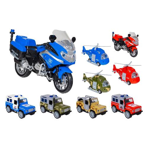 Divertimento assicurato con questi veicoli del pronto intervento. Disponibili in colori assortiti un'elicottero, un fuoristrada o una moto da strada.