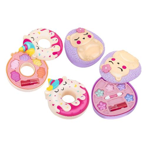 Romantica trousse trucchi ad 1 livello, con cover richiudibile dal design unico. Disponibili 2 assortiti: tenero riccio su superficie glitterata o unicorno a forma di ciambella zuccherata. Incluse cialde di ombretti e 1 lipgloss. I prodotti sono testai e sicuri. Età consigliata: 5 anni +.