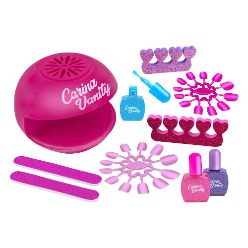 Set per unghie completo di fornelletto asciuga smalto realmente funzionante, tre smalti glitterati, clip per unghie, lime e separa dita per una più facile applicazione. Il fornelletto funziona a batterie, 2*aa non incluse. I prodotti sono testai e sicuri. Età consigliata: 5 anni +.