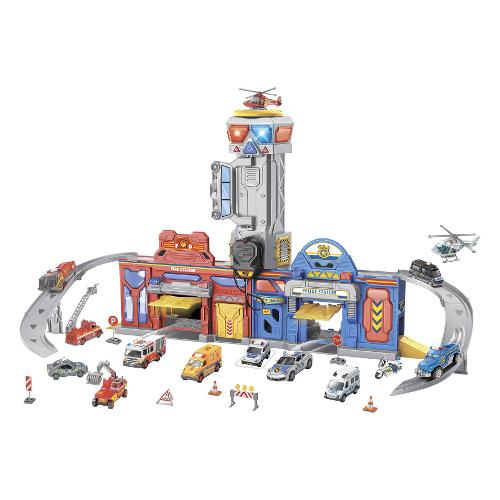 Grande stazione di Emergenza condivisa da Polizia e Pompieri, con luci e suoni realistici, e funzionante a batterie. Dotata di microfono funzionante, due rampe d'accesso, basculanti di entrata ai garage, include due modellini di auto die-cast in scala.