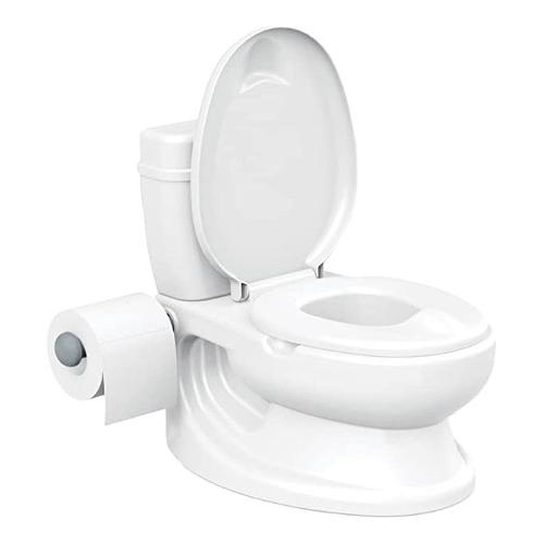 Il vasino educativo ha dettagli e suoni di scarico realistici, è provvisto di adattatore removibile e lavabile, porta carta igienica laterale, e di vano porta giochi per tenere occupati i bimbi durante il suo utilizzo.