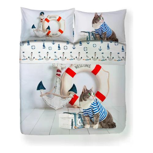 Soddisfa la tua voglia di mare con il gatto marinaio in stampa fotografia su lenzuolo e federa stampati con vividi coloranti reattivi. Il Completo in Cotone di Happidea comprende federa, lenzuolo e angolo tinta unita abbinato. Per un piacevole coordinato letto ideale per dare alla stanza un tocco di allegria senza appesantirsi con un copriletto da aggiungere. Posa semplicemente il lenzuolo per un effetto Uau
