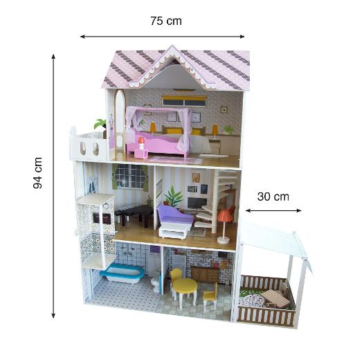 Questa casa delle Bambole è una casetta confortevole e variopinta dotata di 3 piani e 6 stanze, per un’altezza complessiva di 94cm, fabbricata con legno di qualità superiore.