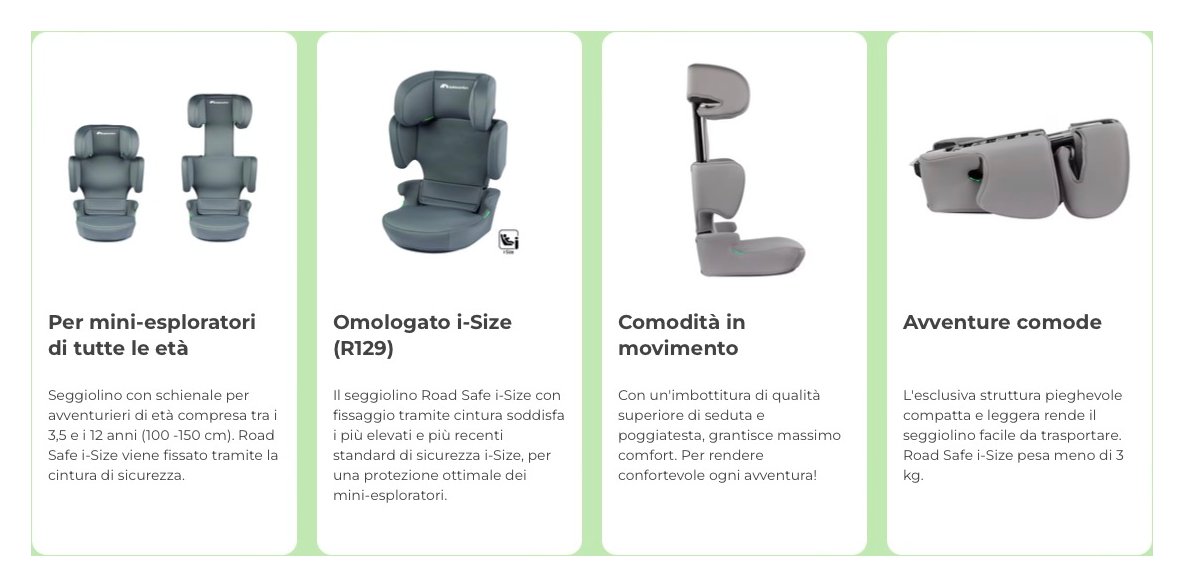 Con il seggiolino road safe i-size, le avventure del tuo piccolo possono iniziare! Road safe i-size ha una struttura pieghevole con un design compatto, unico e leggero. Puoi facilmente trasportare il seggiolino e installarlo in diversi modelli di auto. Road safe i-size soddisfa i più elevati e più recenti standard di sicurezza i-size, che garantiscono al tuo bambino una seduta super sicura per intraprendere emozionanti avventure quotidiane. Con road safe i-size, i mini-esploratori di età compresa tra i 3,5 e i 12 anni possono viaggiare sicuri, verso emozionanti avventure. Road safe i-size ha un struttura pieghevole con un design compatto unico e pesa meno di 3 kg. Grazie al suo design compatto e leggero, puoi trasportarlo facilmente ovunque. Inoltre, può essere facilmente installato in diversi modelli di auto. Con la regolazione del poggiatesta con una sola mano in 14 diverse posizioni puoi fare in modo che il tuo piccolo esploratore possa godersi una gita super confortevole, anche quando hai le mani occupate. Che stia dormendo, sonnecchiando, giocando a "io vedo...", cantando insieme alla radio o semplicemente guardando fuori dal finestrino contemplando il mondo che sfreccia all'esterno, stai certa che il tuo piccolo sarà super comodo in ogni viaggio. Questo seggiolino offre un'imbottitura di qualità superiore di seduta e poggiatesta per il massimo comfort. Così come il glamping sta al campeggio, questo seggiolino sta al comfort di livello superiore, con il tuo piccolo che sarà sempre rilassato durante i viaggi in macchina.