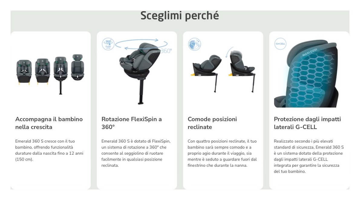 Emerald 360 s garantisce comfort e sicurezza duraturi, adattandosi alla crescita del tuo bambino dalla nascita fino a 12 anni (150 cm /36 kg) con la rotazione a 360° flexispin e quattro comode posizioni reclinate, emerald 360 s risponde alle esigenze della tua famiglia in ogni fase e in ogni avventura. Emerald 360 s non si limita a garantire un comfort prolungato al tuo piccolo, ma anche una sicurezza di lunga durata. È progettato in conformità al massimo e più recente standard di sicurezza per seggiolini auto, noto come i-Size. Oltre a ciò, il seggiolino integra la tecnologia di protezione dagli impatti laterali G-CELL, che assorbe l'urto derivante da un'eventuale collisione e lo disperde, allontanandolo dal corpo del tuo bambino. Accomodare il bambino sul seggiolino auto è molto più semplice grazie a emerald 360 s. Utilizzando flexispin, il seggiolino ruota di 360°, quindi non devi piegarti goffamente per assicurarti che sia posizionato correttamente. Consente di sistemarlo in modo facile e sicuro prima di ogni viaggio, per rendere le lotte quotidiane con il seggiolino auto un ricordo del passato.