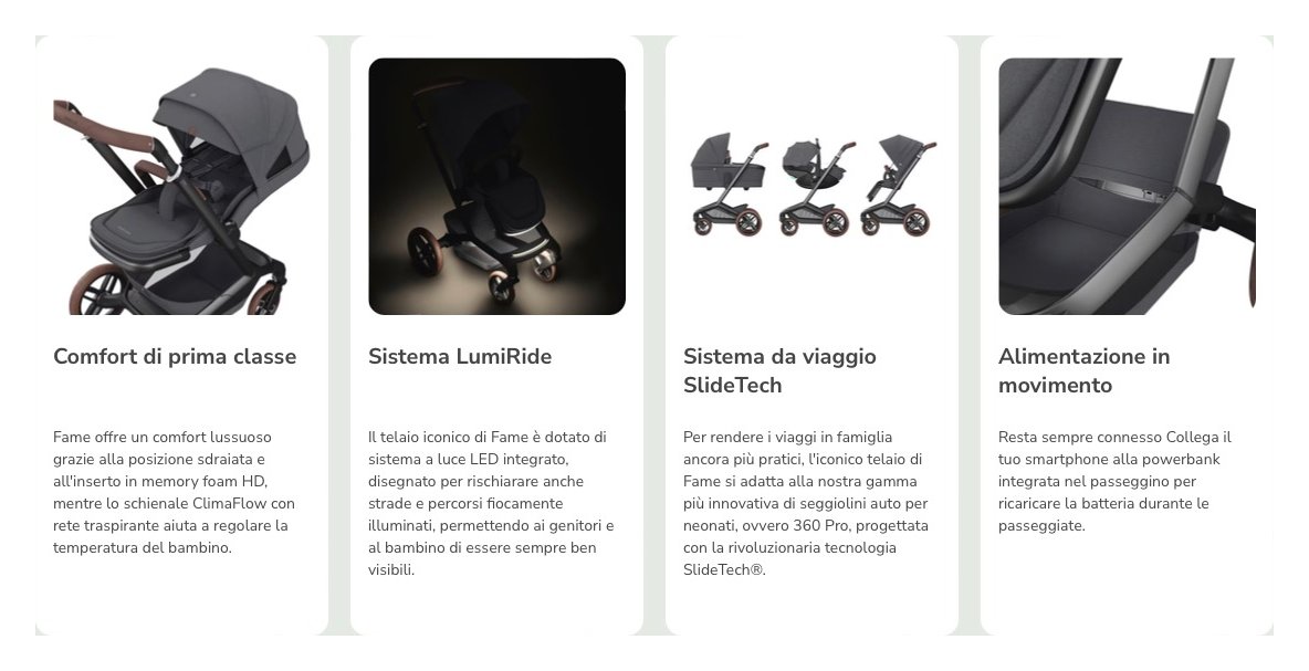 Un'icona di design del futuro. Iconico e avveniristico, il nuovo maxi-cosi fame è progettato per offrire massimo comfort a bambini e genitori. I preziosi dettagli, il design elegante, l'estetica moderna e le funzionalità innovative rendono fame un passeggino a prova di futuro. Un passeggino all'avanguardia per accompagnare le famiglie moderne nel futuro. La seduta ergonomica di fame offre uno spazio lussuoso per il tuo bambino, dove potrà dormire in posizione sdraiata o stare seduto e godersi il viaggio. La seduta è dotata di una morbida imbottitura e di una rete climaflow per una regolazione ottimale della temperatura, in modo che il tuo piccolo stia comodo tutto l'anno. L'ampia capottina estensibile upf 50+ offre la massima protezione dal sole per il bambino e una finestra di ventilazione. Sistemare il bambino nel passeggino non è mai stato così facile grazie alle cinture easy-in di fame, che mantengono le cinture aperte e posizionate lateralmente. La fibbia magnetica a chiusura rapida rende l'installazione ancora più semplice e veloce. Fame dispone di un'ampia gamma di vani portaoggetti per avere tutto quello che ti serve a portata di mano, mentre con i pulsanti memory puoi invertire la seduta facilmente. Fame è ricco di elementi innovativi che semplificano la vita quotidiana ai genitori e ogni viaggio più confortevole per il bambino. Grazie alle ruote all-terrain e alle sospensioni cosicruise, il comfort del tuo piccolo non diminuirà, ovunque andrete. E per i genitori, la pratica chiusura compatta gli rende la vita più semplice. Fame è dotato di un sistema lumiride che illumina il percorso davanti a te e mantiene sia te che il tuo piccolo sicuri e visibili anche al buio. E c'è anche una powerbank integrata per mantenere carico il telefono anche in viaggio. Il telaio iconico di fame consente l'aggancio della nostra gamma di seggiolini auto per neonati più innovativa. I nostri seggiolini auto 360 pro, progettati con la rivoluzionaria tecnologia slidetech®, si agganciano semplicemente al telaio aerodinamico di fame. La rivoluzionaria tecnologia scorrevole del seggiolino è stata progettata per rendere ogni giorno più facile. Basta con i mal di schiena, i colpi alla testa o le difficoltà a far salire e scendere il tuo bambino dall'auto: è sufficiente agganciare, fare scorrere, girare e si è pronti a partire! Con il travel system slidetech® potrai esplorare il mondo insieme al tuo bambino, dalla nascita fino a 4 anni (22 kg).