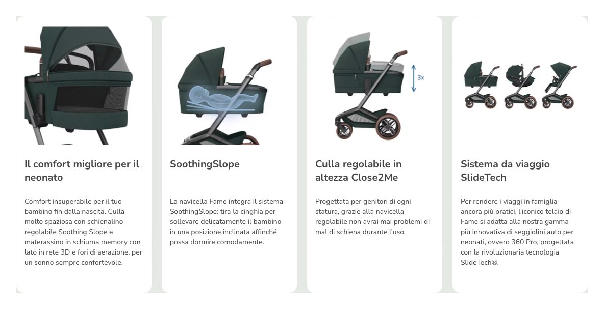 Un'icona di design del futuro. Avveniristico senza tempo, la navicella maxi-cosi fame è progettata per offrire massimo comfort a bambini e genitori i preziosi dettagli, il design lineare, l'estetica moderna e le funzionalità innovative rendono fame un modello intramontabile. Una navicella all'avanguardia per accompagnare le famiglie di oggi nel futuro. Il tuo neonato viaggia in tutta comodità fin dal primo giorno con la navicella fame. Una navicella ampia e spaziosa con un materasso reversibile e traspirante in memory foam e una finestra di ventilazione per garantire al tuo neonato una temperatura sempre confortevole e il massimo comfort durante il sonno. E' progettata con sistema maxi-cosi soothingslope integrato, che consente, tramite una pratica cinghia, di inclinare lo schienalino per ridurre al minimo il reflusso. La navicella fame di maxi-cosi offre un comfort lussuoso sia al bambino che al genitore. Per le mamme e i papà più alti (o più minuti), la navicella close2me è regolabile in altezza, così non dovrai mai sollecitare la schiena durante l'uso. I pulsanti memorya consentono di sganciare la navicella dal telaio del passeggino in modo più semplice e rapido e, all'occorrenza, di chiuderla senza difficoltà. La navicella fame è dotata anche di comode tasche invisibili per tenere gli effetti personali al sicuro e a portata di mano. La navicella fame è progettata per garantire comfort e praticità di tutti i giorni, grazie a caratteristiche come la capottina estesa che protegge il tuo piccolo dal sole e la maniglia centrale per il trasporto che consente di reggere agevolmente la navicella con due mani. Ma è anche progettata per non chi non vuole rinunciare allo stile. La navicella fame utilizza finiture e dettagli di prima qualità, oltre a morbidi tessuti eco care realizzati con bottiglie di plastica riciclate. Così la tua navicella è sempre pronta a stupire.