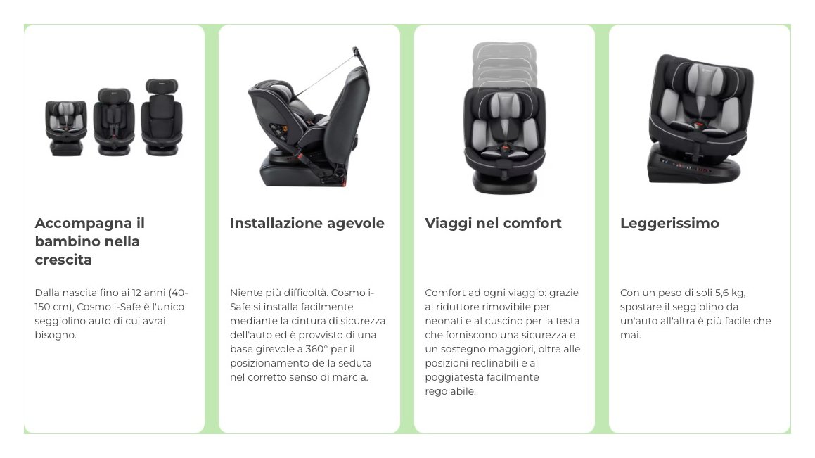 Cosmo i-Safe è l'unico seggiolino auto di cui avrai bisogno. Progettato per accompagnalo nella crescita, si installa facilmente mediante la cintura di sicurezza dell'auto. La base girevole consente di passare agevolmente da un senso di marcia all'altro. Garantendo sicurezza affidabile e comfort duraturo, Cosmo i-Safe è il seggiolino auto ideale per ogni viaggio. Cosmo i-Safe si installa mediante la cintura di sicurezza che tiene il seggiolino in posizione salda e garantisce una sicurezza affidabile.
