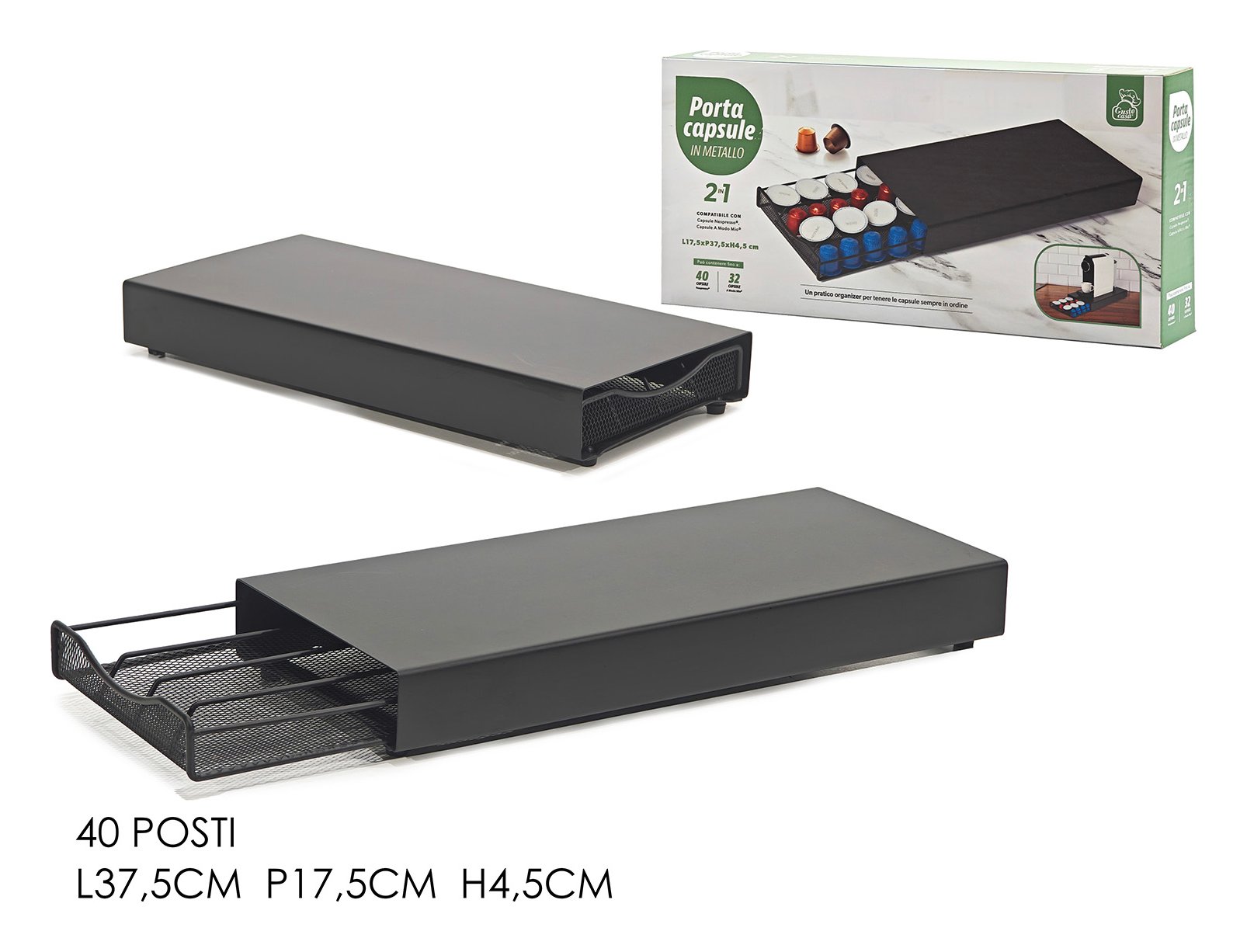 Cassetto scorrevole può contenere fino a 40 capsule. Consente di appoggiare la macchina del caffè sulla parte superiore. Compatibile con capsule Nespresso e A Modo Mio.
