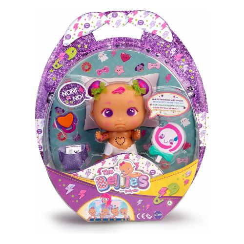 Noni No è la Bellies più scontrosa e super divertente; con due bellissimi codini con fiocchetti verdi e un pannolino viola glitterato. E' pieno di sorprese: se rimuovi il cordone ombelicale il suo cuore inizierà a pbattere e parlerà con un suo linguaggio molto divertente e diverso dagli altri Bellies. Con una voglia a sorpresa ... e una simpatica sorpresa nel pannolino. Include alcuni accessori super divertenti come un lecca lecca giocattolo/massaggia gengive e Bellypedia.