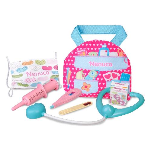Set medico con tutto il necessario per curare nenuco. Include lo stetoscopio, termometro, il bastoncino per controllare la gola,un vaccino e un cerotto. E non dimenticare di mettere anche a lui la maschera quando hai finito!