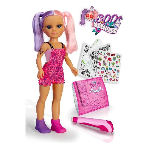 Include più di 300 diversi modelli di tatuaggi. Grazie alla macchinetta inclusa sarà facile e divertente applicarli, funziona con acqua. Indossa un abito con paillettes, top e scarpe rosa, con lunghi capelli rosa e viola raccolti in due codini che completano il look trendy!
