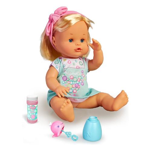 Nenuco fa le bolle! Bambola con corpo rigido, capelli biondi, una bellissima fascia rosa e un vestitino color verde pastello. E’ interattiva