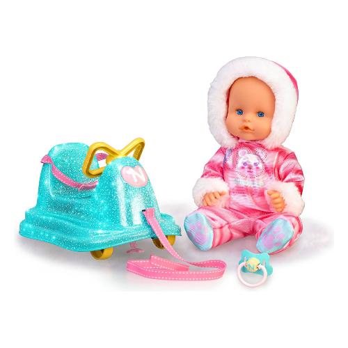 Con le ruote, la cintura di sicurezza e la cinghia per poter portare nenuco a fare una passeggiata e a giocare sulla neve. Indossa una tuta rosa con pellicca sul cappuccio e include il ciuccio. Quando ha freddo sil suo nasino diventa rosso.