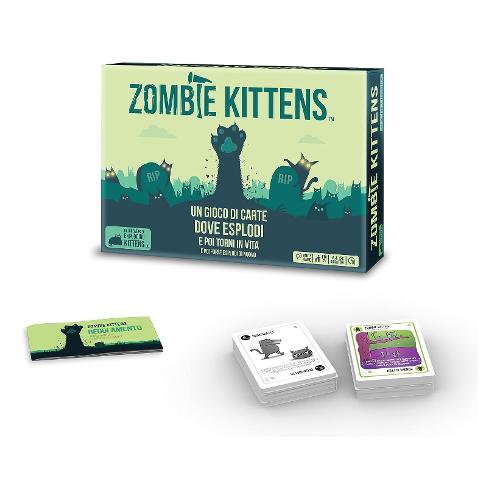 Exploding kittens è un card game veloce e immediato che saprà appassionare tutti: perché tutti amano i gattini...e le esplosioni. I giocatori pescano carte fino a quando qualcuno non incappa nella temuta carta exploding kitten: a quel punto quel qualcuno esplode ed è eliminato dal gioco, a meno che non abbia una carta disinnesgatto per evitare l'esplosione. In zombie kittens è possibile usare potenti carte azione per muovere o evitare la carta exploding kitten, e risorgere dalla tomba con la carta zombie kitten per avere la vostra vendetta!