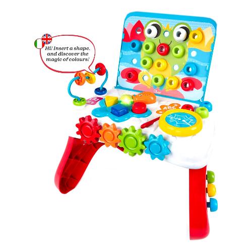 Banco multiattività bilingue che combina attività tipiche dei tavoli educativi per bambini più piccoli con funzioni tipiche dei banchi per bambini in età prescolare. centro attività forme&incastri elettronico con 3 forme colorate.