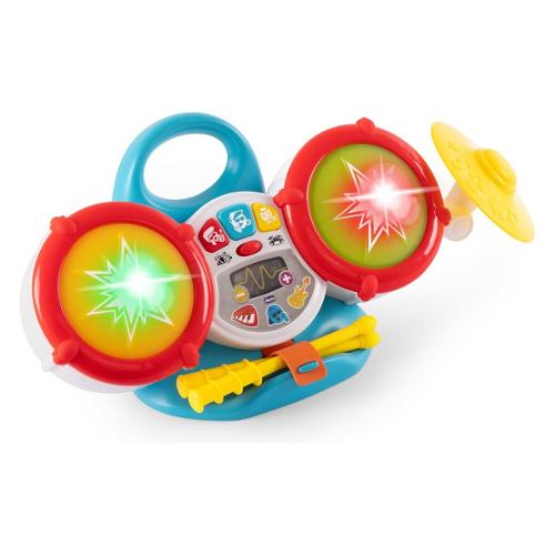 Dotata di due tamburi e un piatto, permette di creare suoni e melodie realistiche, stimolando lo sviluppo dell’udito e migliorando il senso del ritmo.