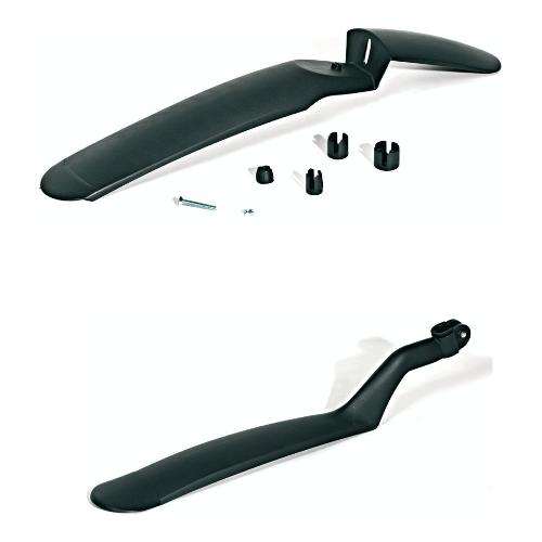 Coppia parafanghi in plastica per mtb da 26 e 28" composto da parafanghi anteriore cm 53 per forcelle con tubo di sterzo da 16 a 28,5 mm e posteriore 54,5 cm adattabile a tubi sella da 24 mm di diametro