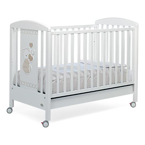 Sponda regolabile a due altezze, per facilitare il riordino del lettino. Anche la rete è regolabile a due altezze, per consentire un pratico uso anche quando il bimbo è neonato. Una delle testate del lettino ha decorazioni con teneri cuori e un dolcissimo orsetto, per un'eleganza senza tempo all'insegna delle tonalità classiche. Le decorazioni in rilievo hanno un effetto "soft touch" grazie al tessuto floccato piacevole al tatto. Il lettino ha un ampio cassetto inferiore