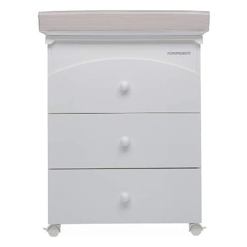 Foppapedretti il bagnetto: dotato di 3 cassetti; piano fasciatoio ribaltabile con chiusura ammortizzata; vaschetta anatomica estraibile, possibilità di estrarre il cassetto superiore anche con la vaschetta inserita; dotato di 4 ruote piroettanti di cui 2 con freno, morbido fasciatoio in spugna rivestito in pvc igenico e lavabile. Dotato di maniglie pomolo in legno di faggio massiccio, testato a Normativa Europea.