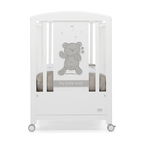 Una testata del lettino, all’insegna del bianco, è decorata con un simpatico orsetto in rilievo e il nome della collezione. Il lettino ha un ampio cassetto inferiore, suddiviso in due scomparti, e ruote gommate antigraffio, con sistema frenante, per facilitare gli spostamenti.