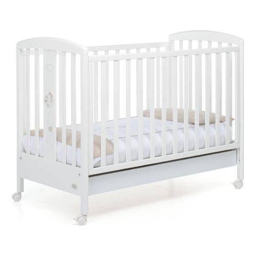 La testata del lettino ha decori in rilievo con un simpatico orsetto che vola su un aeroplanino tra nuvole e cuoricini. Il lettino ha un ampio cassetto inferiore, suddiviso in due scomparti, e ruote con sistema frenante, per facilitare gli spostamenti.
