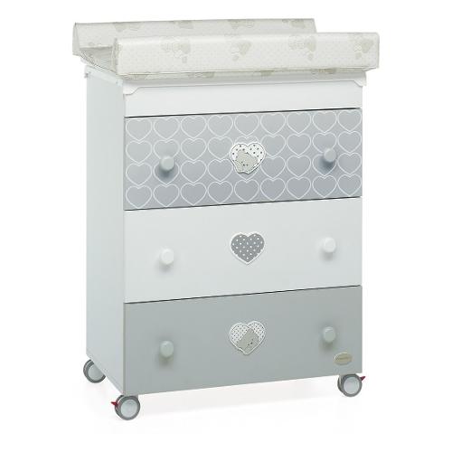 Caratterizzato da tonalità all’insegna del bianco e grigio, sui tre ampi cassetti ha decorazioni con teneri cuori che racchiudono un dolcissimo orsetto. Ha ruote gommate antigraffio, con sistema frenante, per facilitare gli spostamenti.