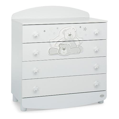 La cassettiera in legno Dolcestella di Foppapedretti ha quattro ampi cassetti, maniglie a forma di stella e decori in rilievo con i due orsetti giocherelloni che caratterizzano tutta la collezione. I decori in rilievo e le stelline possono essere applicati a piacimento per personalizzare la cameretta con un tocco di originalità. Ha anche un ampio piano superiore, dove si può collocare il materassino imbottito (venduto separatamente) per essere utilizzata come pratico fasciatoio. La struttura solida e durevole nel tempo è 100% made in Italy